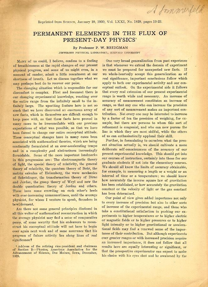 First page of a paper by P.W. Bridgman in Science 71, 19 (1930). This reprint was a personal copy of Arnold Sommerfeld at the University of Munich and was signed by him in the upper right corner.
